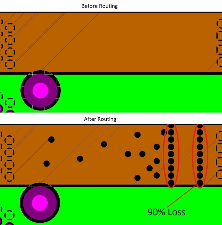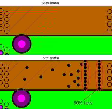 As you can see from the example below, the area in question after routing has a massive 90% loss in current due to vias being routed in the plane area, which would have been catastrophic to the design.