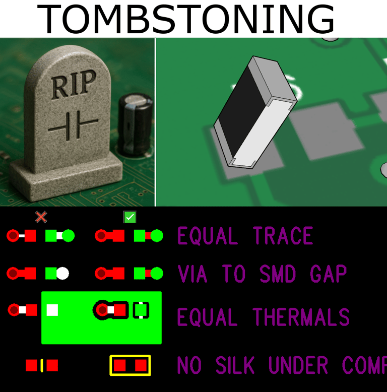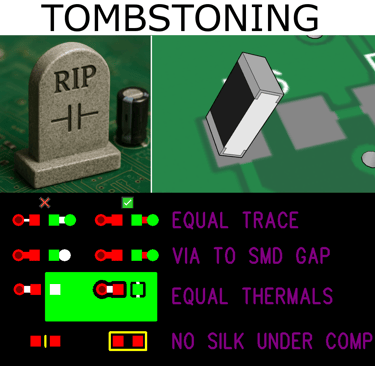 Tombstoning is a surface-mount soldering defect on a PCB, where a component like a resistor or cap stands upright instead of lying flat during assembly. This occurs when the solder on one end of the component melts and wets before the other, causing surface tension to pull the component upright.